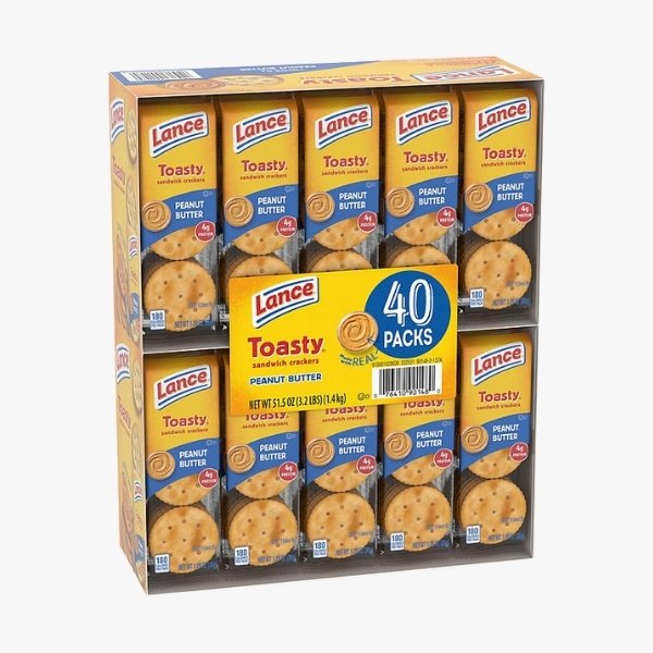 Lance sandwich crackers provide a wholesome and filling snack made with real ingredients. Each package of these bulk sandwich crackers contains 40 individual snack packs of Lance Toasty Sandwich Crackers filled with peanut butter. Between the crispy sandwich crackers and the soft peanut butter, it’s easy to see how these have become a staple in many households, vending machines and convenience stores across the nation. Every easy-to-open package contains six cracker sandwiches and 4 g of protein.