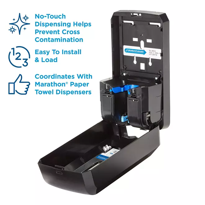 The Marathon® Automated Soap Dispenser combines the efficiency you expect with the durability you need for day-to-day performance. Hygienically sealed refills and no-touch operation help reduce the risk of cross contamination and upgrade the look of your facility. Pair with other Marathon® Towel dispensers for a coordinated, hygienic and efficient restroom solution. Designed for restrooms, classrooms, food prep areas or any workstation where good hygiene is essential.