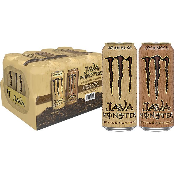 Each pack contains 12 cans of Monster Java flavors?six Mean Bean? and six Loca Moca?. Monster coffee energy drink cans are easily portable as well as perfectly sized for satisfying the need for coffee and energy. While Mean Bean offers classic chilled coffee and cream flavors, Loca Moca is spiked with a dose of real chocolate, a favorite for those who love their local coffee house’s iced mocha. They’re both made with brewed coffee, cream and sugar, as well as an array of added vitamins and minerals to leave drinkers feeling energized and up for any challenge.