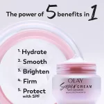 Olay Super Cream with SPF anti-aging facial moisturizer delivers 5-in-1 benefits, it hydrates, smooths, brightens, firms, and protects with SPF. Olay Super Cream leaves your skin primed and ready for makeup by giving it a smooth, matte finish. Olay Super Cream is an anti-aging moisturizer that helps visibly reduce dark spots and fine lines while providing 24-hour hydration and protection for all skin tones against harsh UVA and UVB rays. Thanks to Olay Super Cream’s powerful ingredients, including Vitamin C, Hyaluronic Acid, Niacinamide, Vitamin E, and Collagen Peptide, your skin will get everything it needs to stay brighter and more radiant all with one face cream.