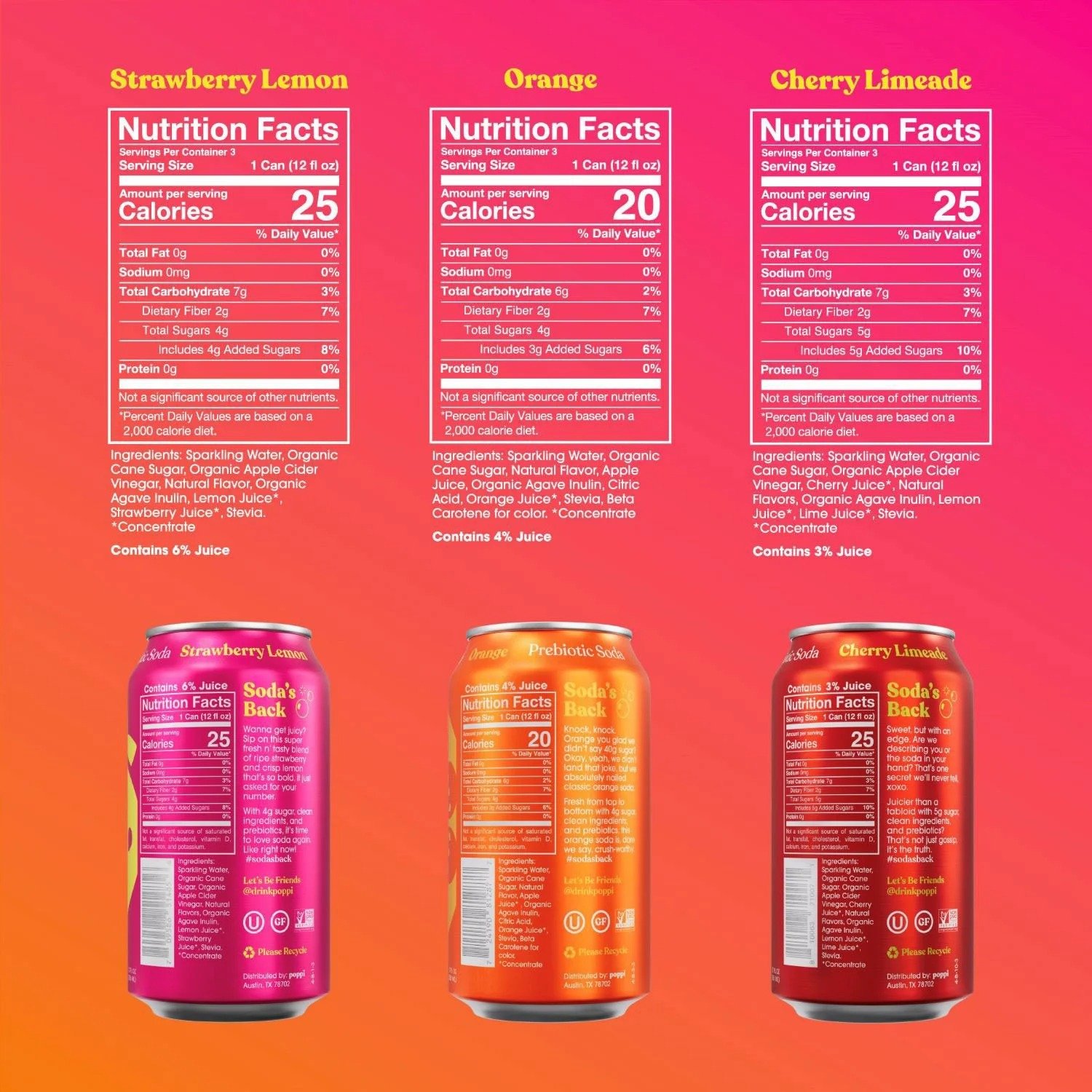 Poppi is made with real ingredients and is both vegan and gluten-free. It delivers the soda experience you love with added prebiotics and fiber. Each can contains only 25 calories and 5g or less of sugar. From Texas to your taste buds, Poppi is here to redefine your soda experience.