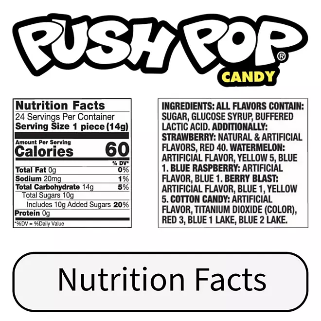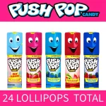 Experience a delightful variety with our Push Pop lollipops. Each box includes 24 0.5-ounce lollipops in four different flavors. The assortment features Strawberry, Blue Raspberry, Watermelon, and the intriguing Sour Mystery. Each flavor brings its own unique tang, ensuring a delightful surprise with every lick.