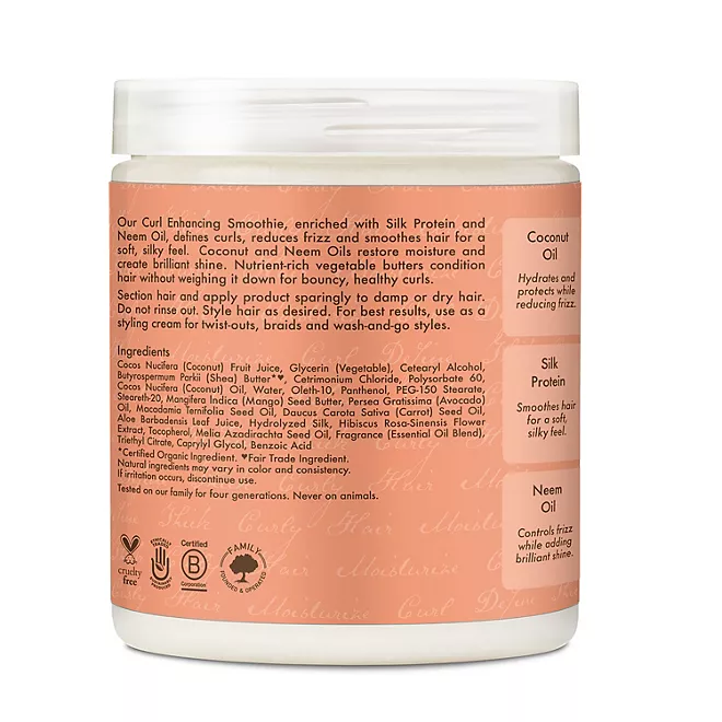 SheaMoisture Coconut & Hibiscus Curl Enhancing Smoothie provides curl definition, bounce, and frizz control. This curly hair product contains coconut oil, silk protein, and neem oil, all of which contribute to adding a brilliant shine to your hair. It’s a hair cream and styling cream that is formulated without silicones, sulfates, parabens, phthalates, mineral oil, or petrolatum.